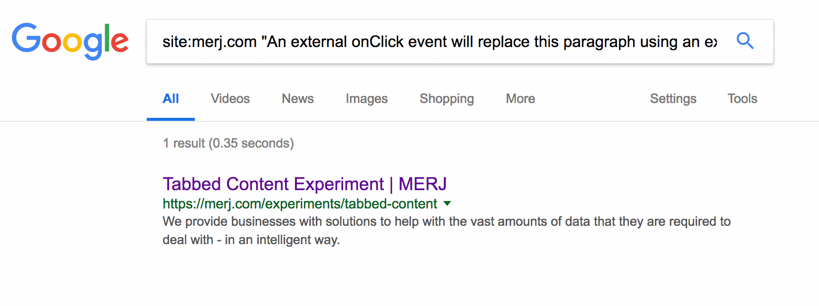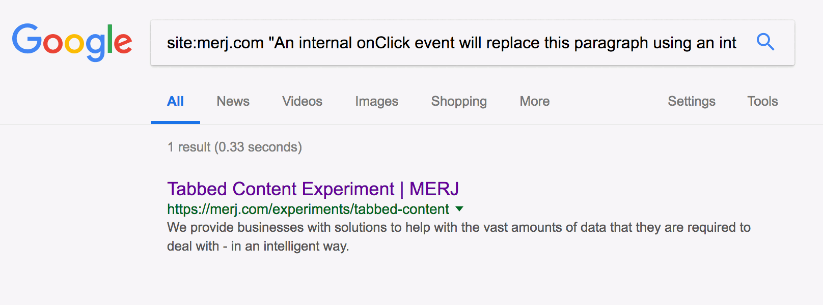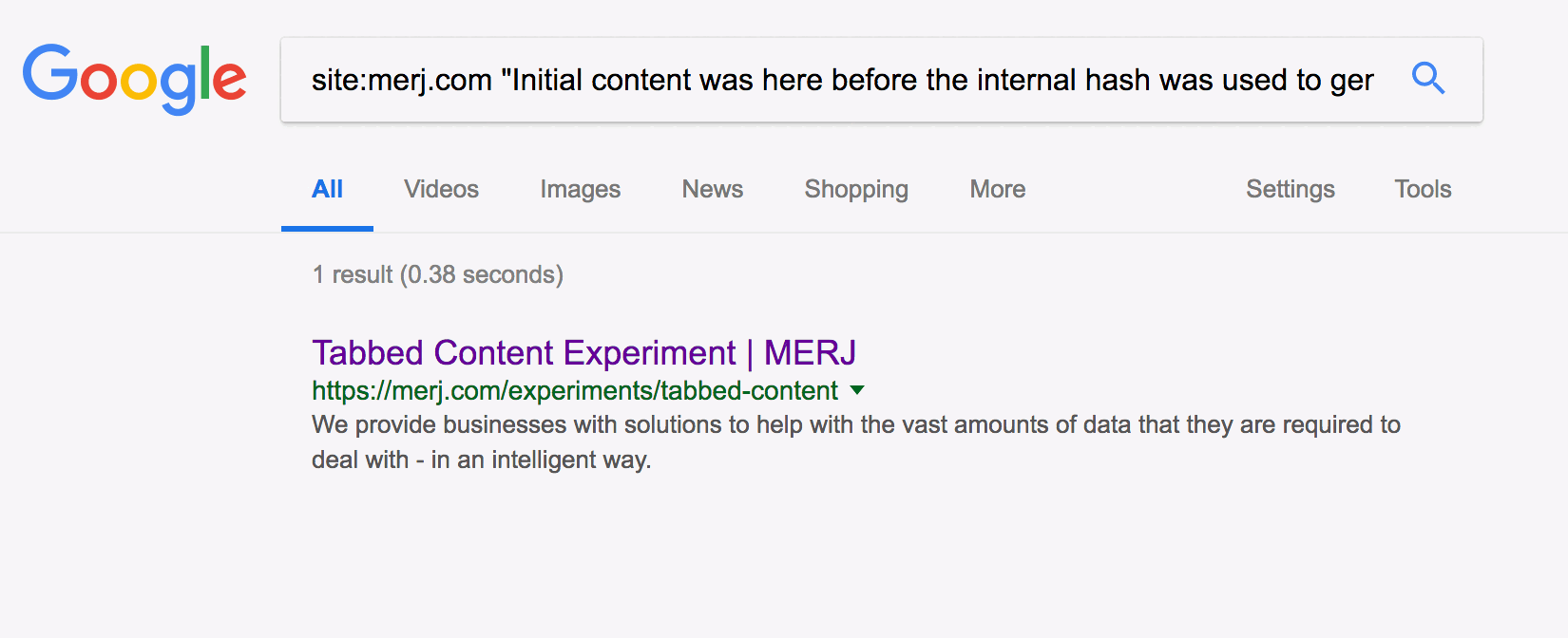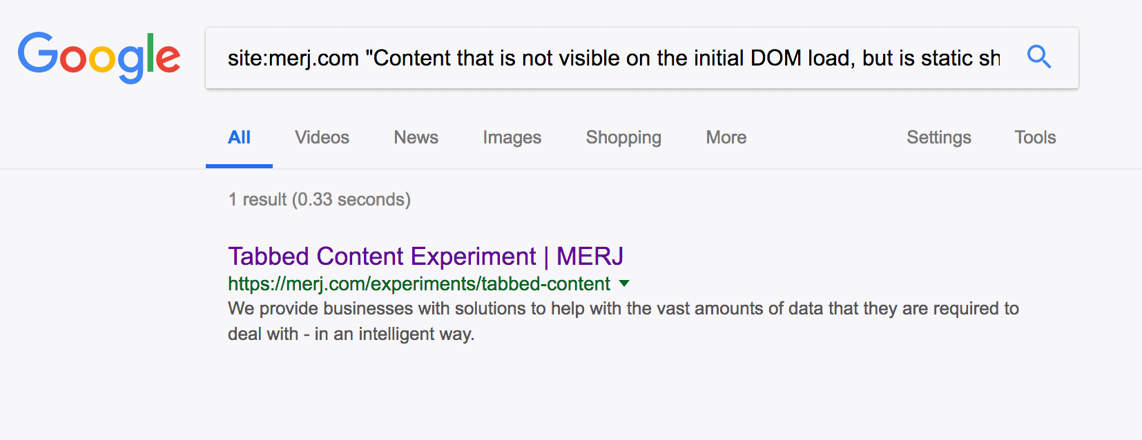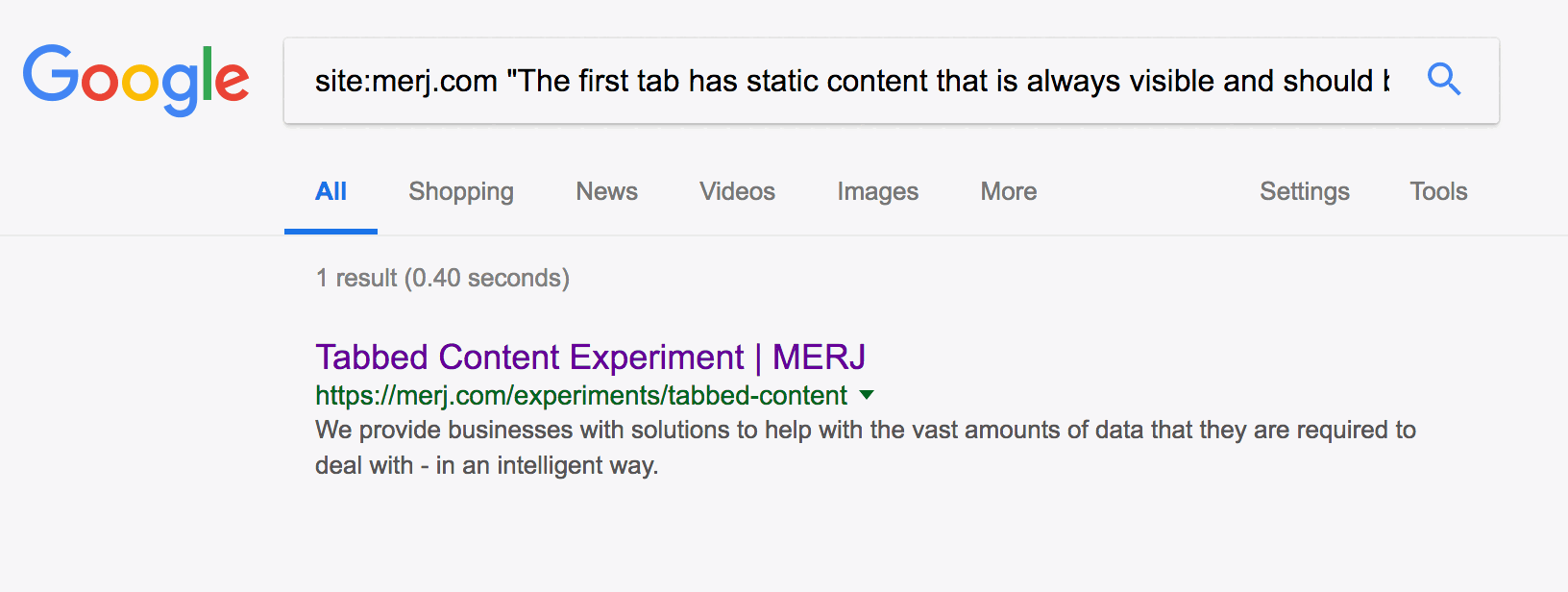 We tested one non-tabbed piece of information and tabbed eight different tabs, with 12 potential scenarios. The initial control test shows that the static HTML outside of the tabbed area is indexable.