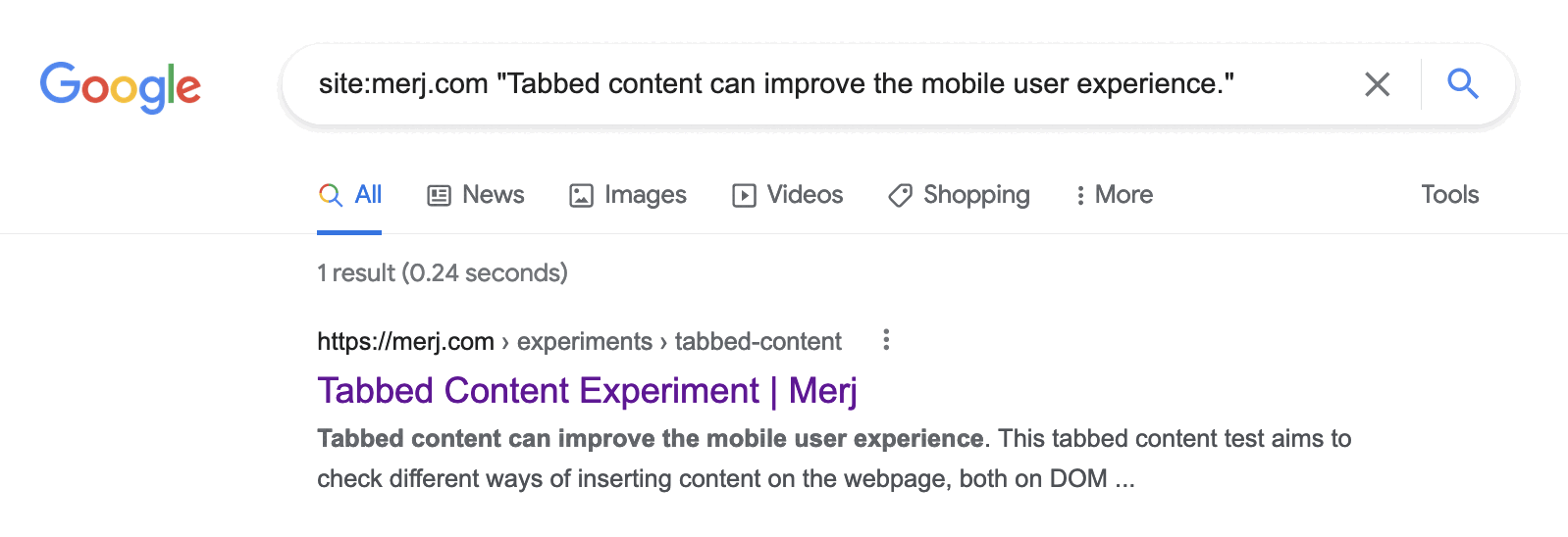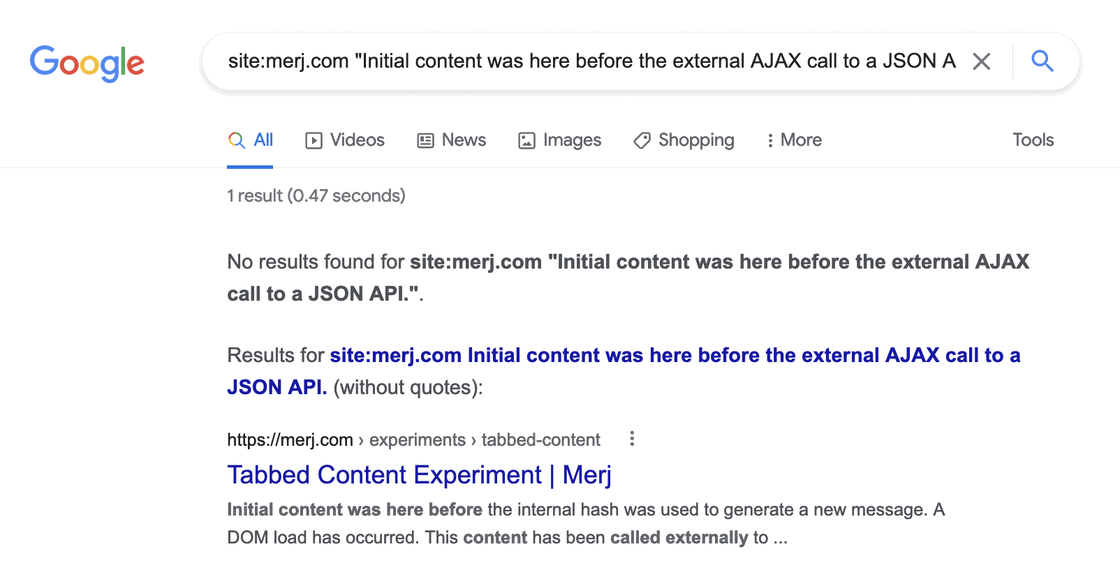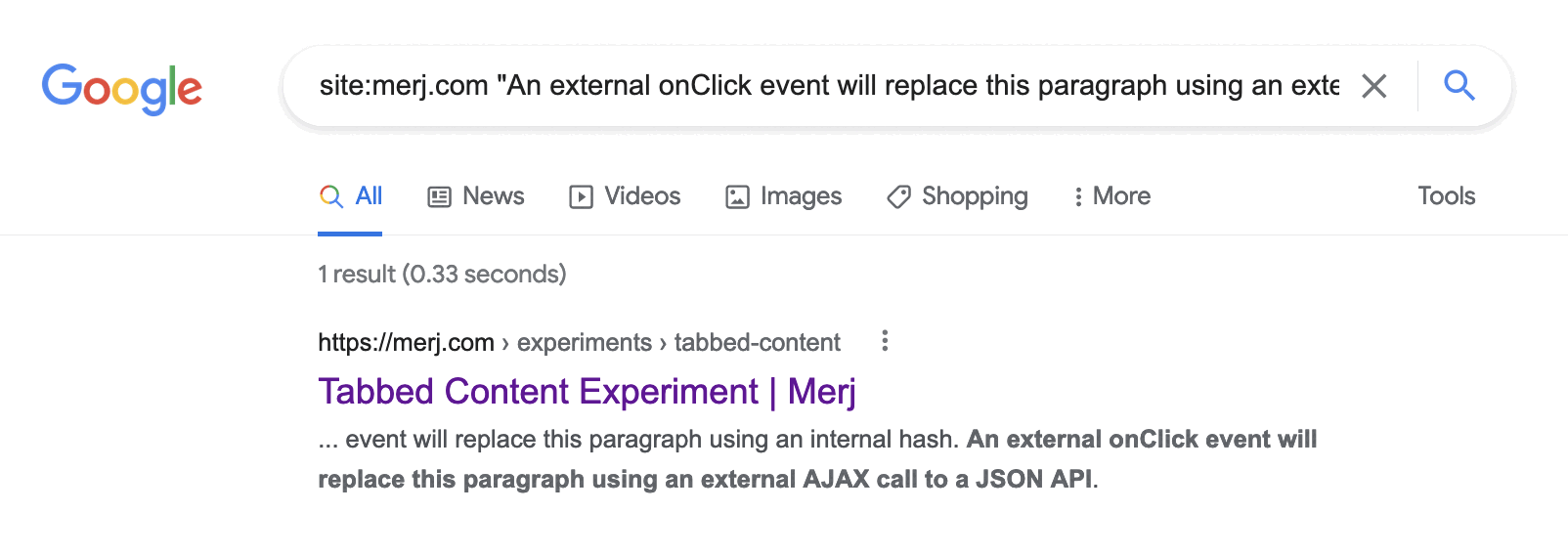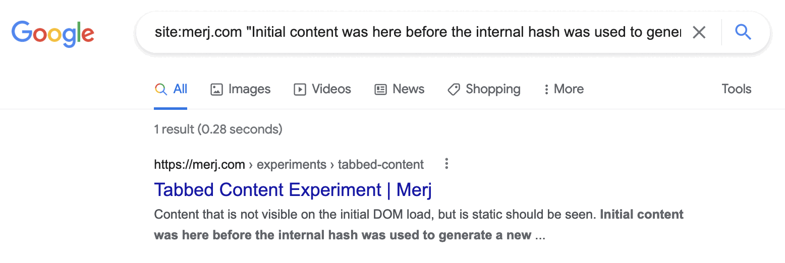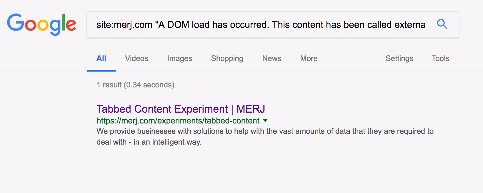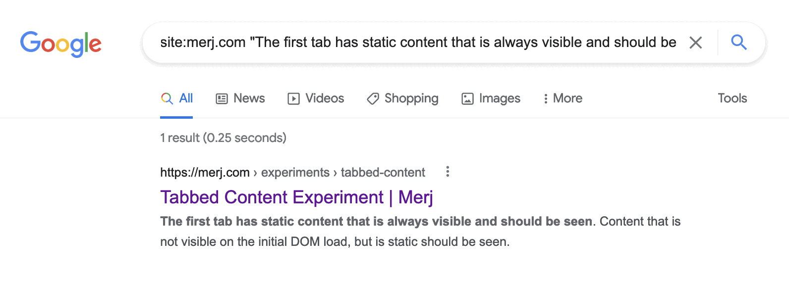 We tested one non-tabbed piece of information and tabbed eight different tabs, with 12 potential scenarios. The initial control test shows that the static HTML outside of the tabbed area is indexable.