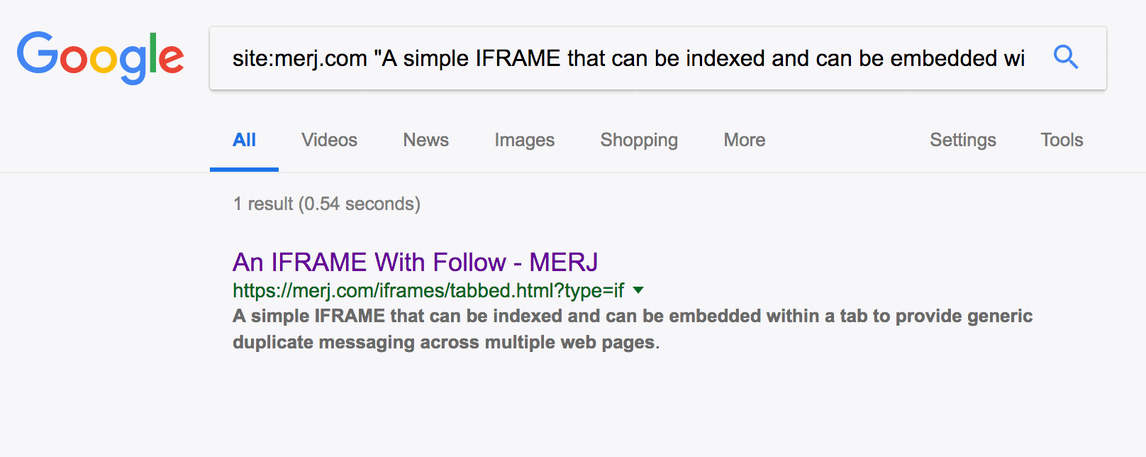 site:merj.com "A simple IFRAME that can be indexed and can be embedded within a tab to provide generic duplicate messaging across multiple web pages."