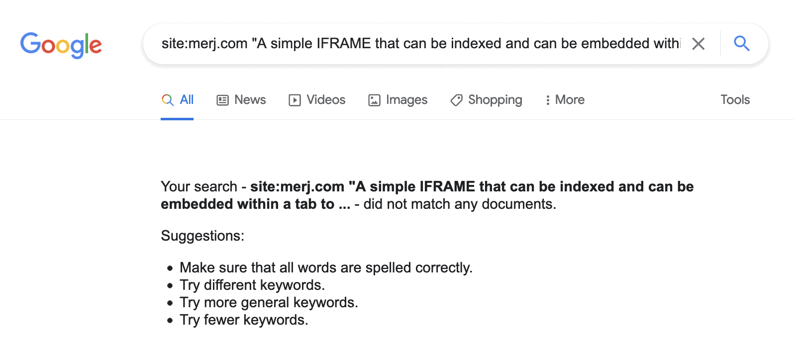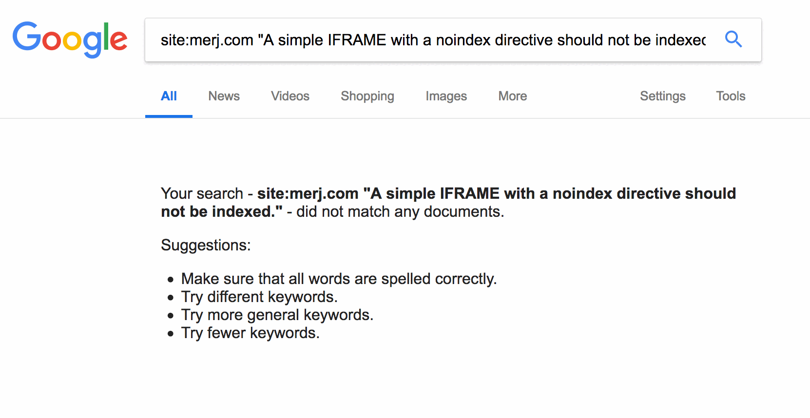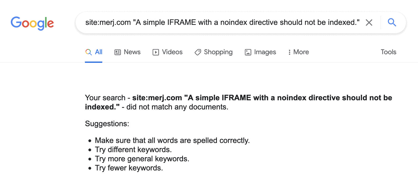 site:merj.com "A simple IFRAME with a noindex directive should not be indexed."