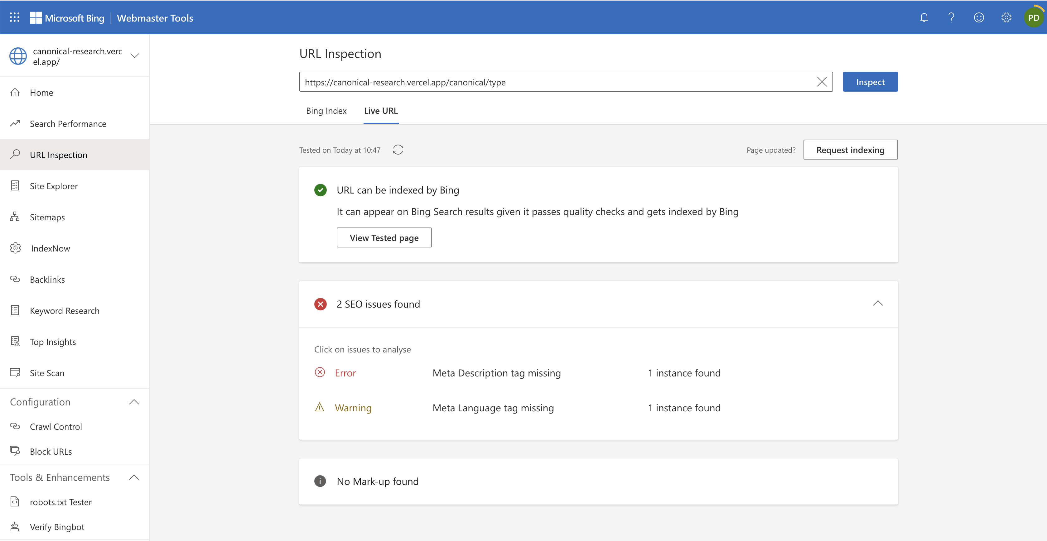 While Google reports “None” for the User-declared canonical, hinting it didn’t recognise a canonical link tag, in Bing Webmaster Tools, the live URL inspection didn’t report the presence nor flag issues with the canonical for any URLs in our testing set.