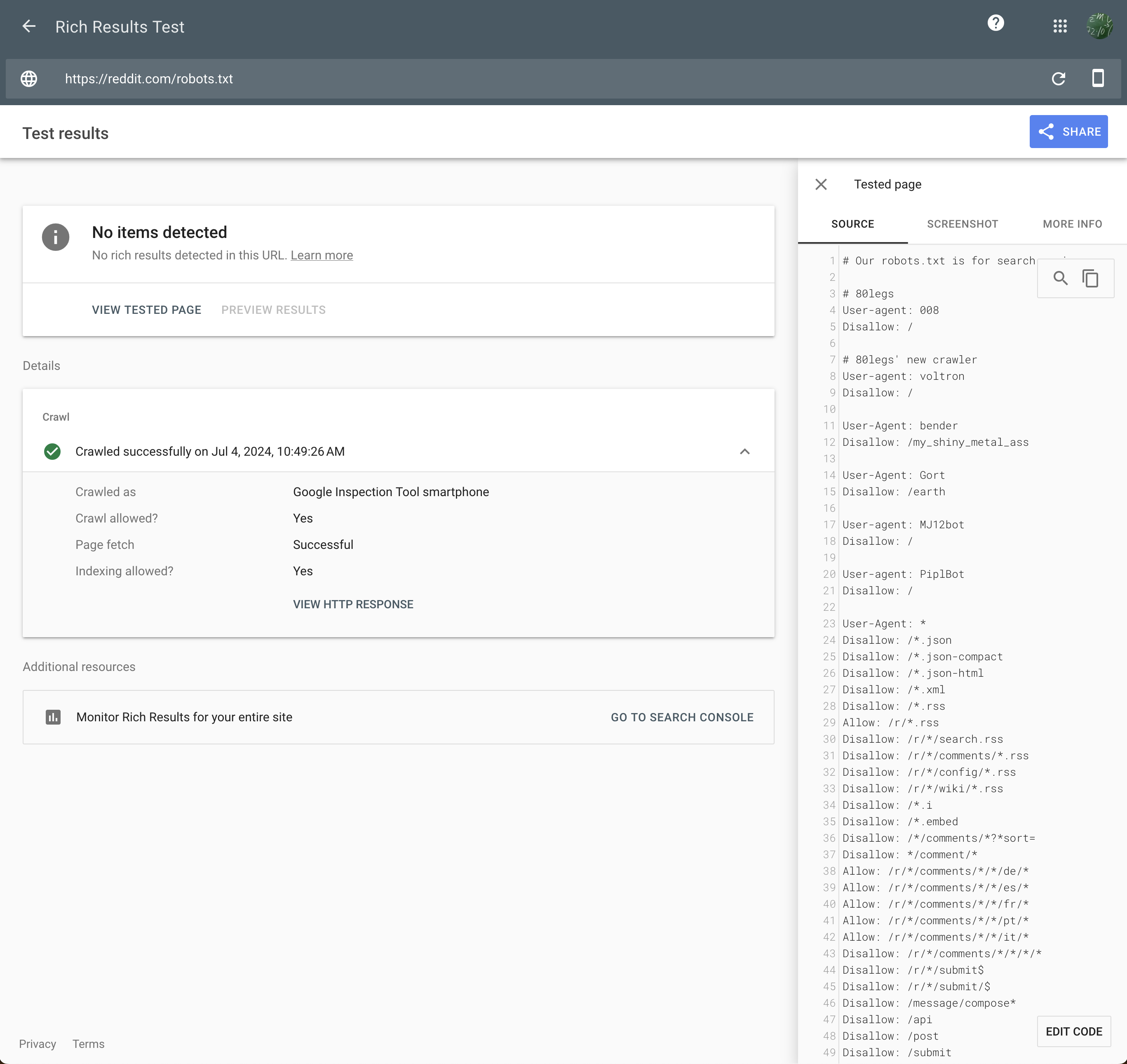 This leads us to question whether search engines like Google might make exceptions for Reddit. However, this seems unlikely. It’s more plausible that Reddit might be serving different robots.txt files to different user-agents.